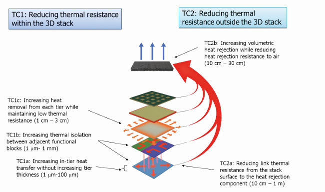Abb. 4: Herausforderungen im Bereich des Multi-scale-Thermalmanagements innerhalb und außerhalb eines 3DHI-Stapels gemäß DARPA-Projekt