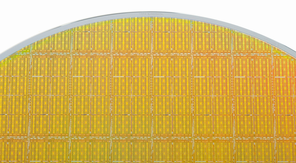 Abb. 3: Dieser Siliziumwafer enthält Chips zum Testen von Kühlsystemen für dreidimensionale integrierte Mikroelektronik. Jeder Chip besteht aus Schaltkreisen, die innerhalb eines 3D-Stapels Wärme erzeugen und die Temperatur beim Ein- bzw. Aufbringen von Kühllösungen messen