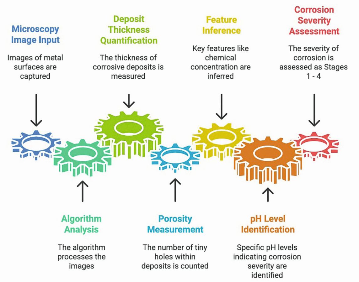 As illustrated in Figure 4, the high-level architecture of the AI-based method highlights how these microstructural and chemical features are used to classify corrosion stages without human intervention.