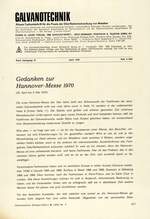 Die erste Hannover-Messe der 70er Jahre sieht den Schwerpunkt der Fachfirmen der deutschen Galvanotechnik nicht wie viele Jahre zuvor in Halle 10, sondern in der umbenannten Halle 9 (früher Halle 11). Die Stände sind größer und schöner geworden. Der erfahrene Messebesucher erhält optisch einen ganz neuen Eindruck und wird feststellen können, daß die Fachfirmen der Galvanobranche weder Mühe noch Kosten gescheut haben, ein entsprechend ...