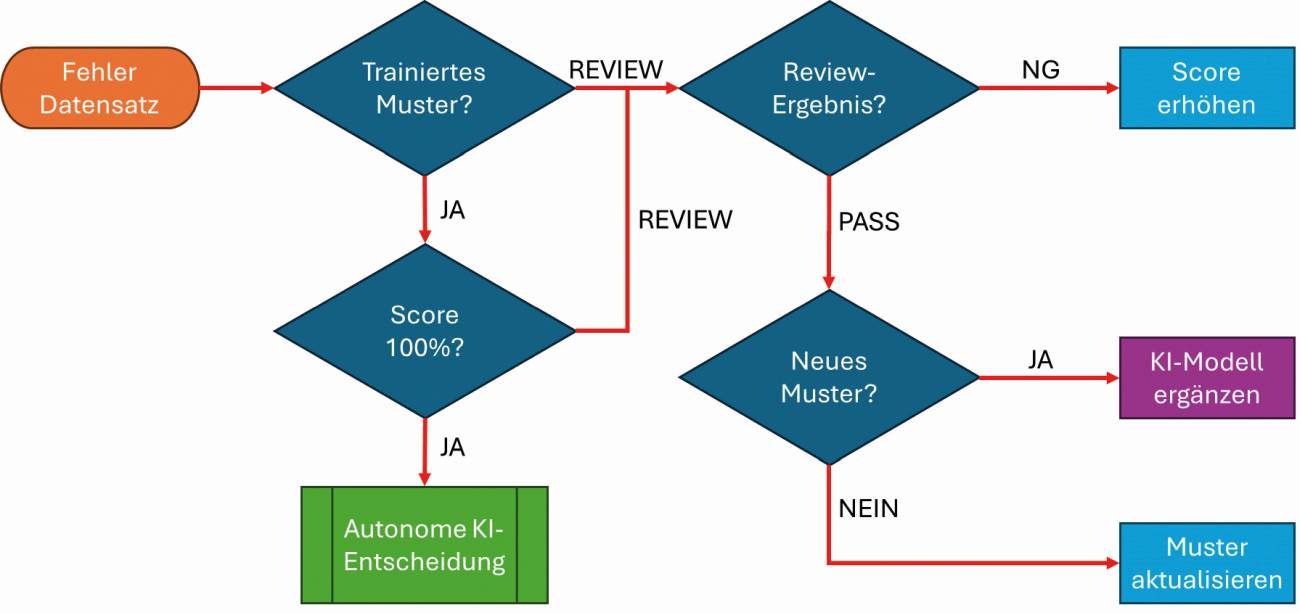 El talón de Aquiles del aprendizaje automático es el decisor/entrenador humano. Si su juicio es erróneo, el modelo de IA está mal programado. Por eso, la "revisión inteligente" de Koh Young funciona con la fiabilidad descrita del error (véase la Fig. 2). Es una salvaguarda para garantizar que las decisiones erróneas no pongan en peligro el modelo de IA. Sólo cuando un nuevo enlace ha sido verificado al 100%, el modelo de IA incorpora el nuevo enlace a la evaluación autónoma.