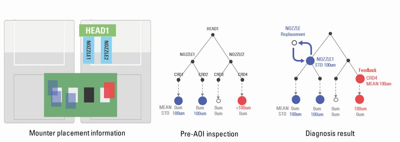 Para diagnosticar el proceso de colocación se utilizan tecnologías de IA similares. Con KPO-M (Koh Young Process Optimiser Mounter), hay que distinguir entre una auténtica desviación del componente y un fallo del proceso causado por herramientas de colocación (boquillas), alimentadores o carretes defectuosos. Los componentes defectuosos en el proceso de colocación provocan una mayor dispersión en la posición de colocación. Esto no puede compensarse corrigiendo la posición de colocación. También en este caso hay que dar instrucciones al personal de la línea para que compruebe o sustituya los componentes correspondientes. En cambio, una desviación real puede reconocerse por el desplazamiento del valor medio a la posición de colocación. Esto puede eliminarse fácilmente mediante una orden de corrección a la máquina de pick and place. La figura 5 muestra el principio del análisis del montador KPO.