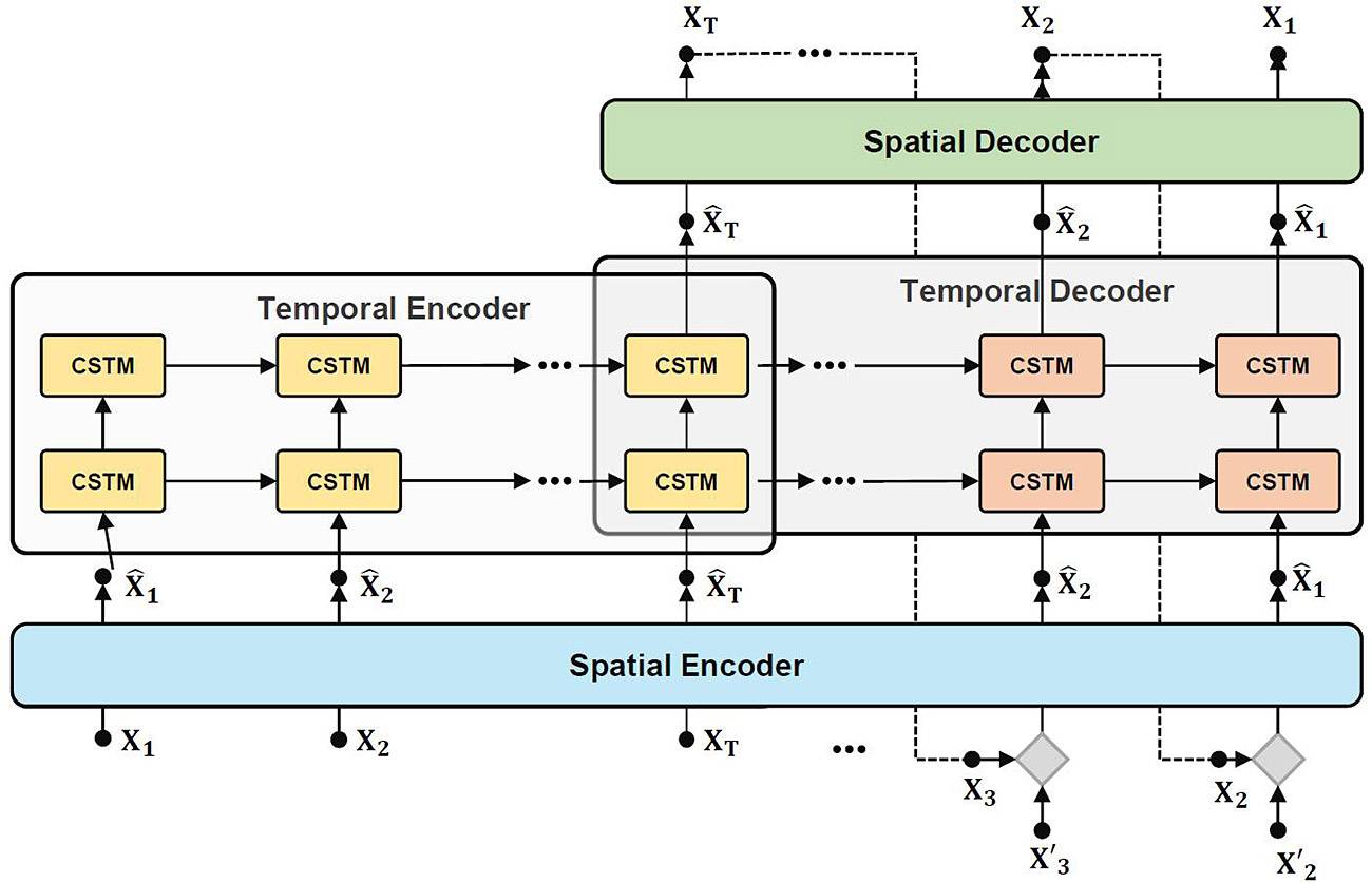 Fig. 3: Red neuronal recurrente (RNN) - El codificador espacial convierte los datos multidimensionales del proceso en información lineal. El codificador temporal comprime los datos de entrada y elimina las variables perturbadoras/errores. El decodificador temporal vuelve a descomprimir los datos y reconstruye el proceso en curso sin variables perturbadoras. El decodificador espacial vuelve a convertir los datos del proceso reconstruido en información de línea. La comparación del codificador y decodificador espacial muestra ahora las anomalías y errores en los datos de entrada y la IA del proceso de impresión puede asignar los patrones de anomalías a errores del proceso, como una cuchilla defectuosa (véase también la Fig. 4).