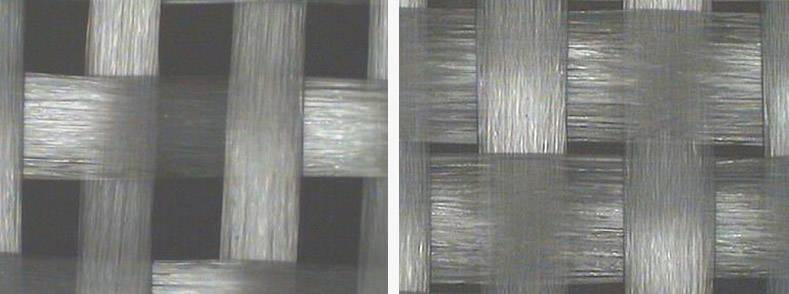 Abb. 2: Vergleich ungespreiztes (l.) mit gespreiztem (r.) Glasgewebe 1080. Beim ungespreizten Glasgewebe sind die Zwischenräume zwischen den Gewebeknoten von Kette und Schuss größer, so dass die Luftdurchlässigkeit des ungespreizten Glasgewebes höher ist [9].