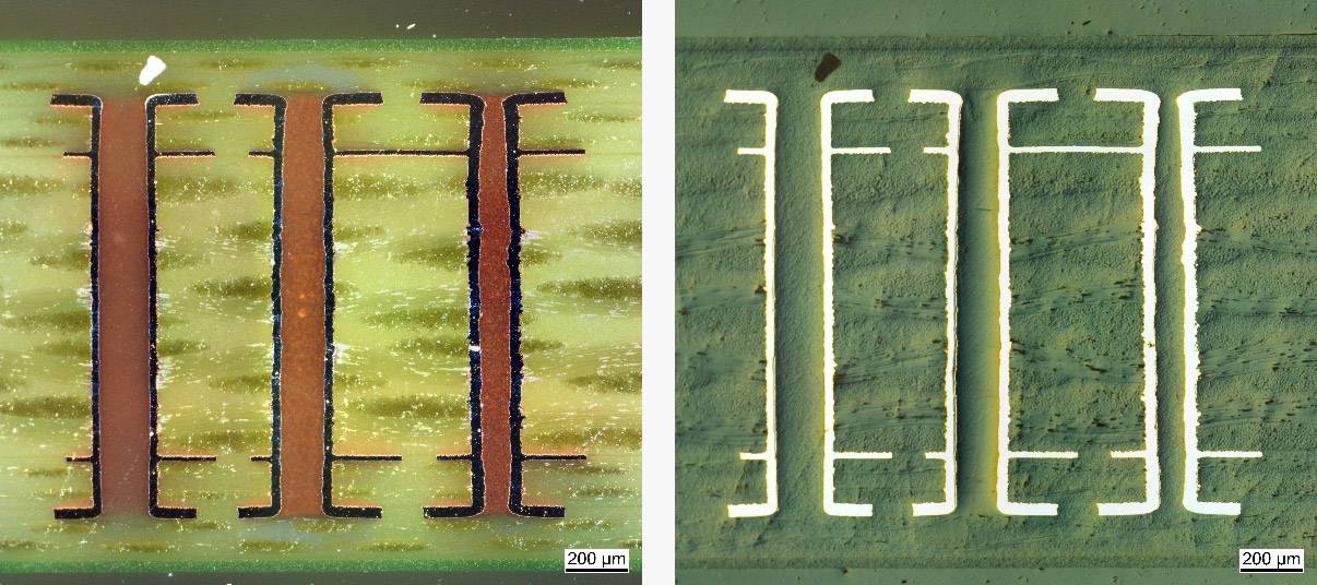 Die Epoxidharzfehler, die im CT-Röntgenverfahren detektiert wurden, wurden gezielt im Querschliff analysiert. Pro Schliffebene sind aber neben den Buried Vias mit defekten Harzstrukturen auch die Buried Vias ohne Fehler zu erkennen. Dadurch können sowohl die defekten als auch die fehlerfreien Harzstrukturen in einer Schliffebene analysiert werden. Dabei hat sich gezeigt, dass sich die Ergebnisse der CT-Röntgenanalyse im Querschliff bestätigen. Es konnten alle fehlerhaften und auch fehlerfreien Epoxidharzstrukturen nachgewiesen werden. Die Abbildungen 10 und 11 zeigen exemplarisch die Auswertung der Buried Vias mit einem Bohrdurchmesser von 200 µm zum einem mit dem Prepreg NP-155FB-1080MR (Abb. 10) und zum anderen mit dem Prepreg NP-155FB-1078MR (Abb. 11).