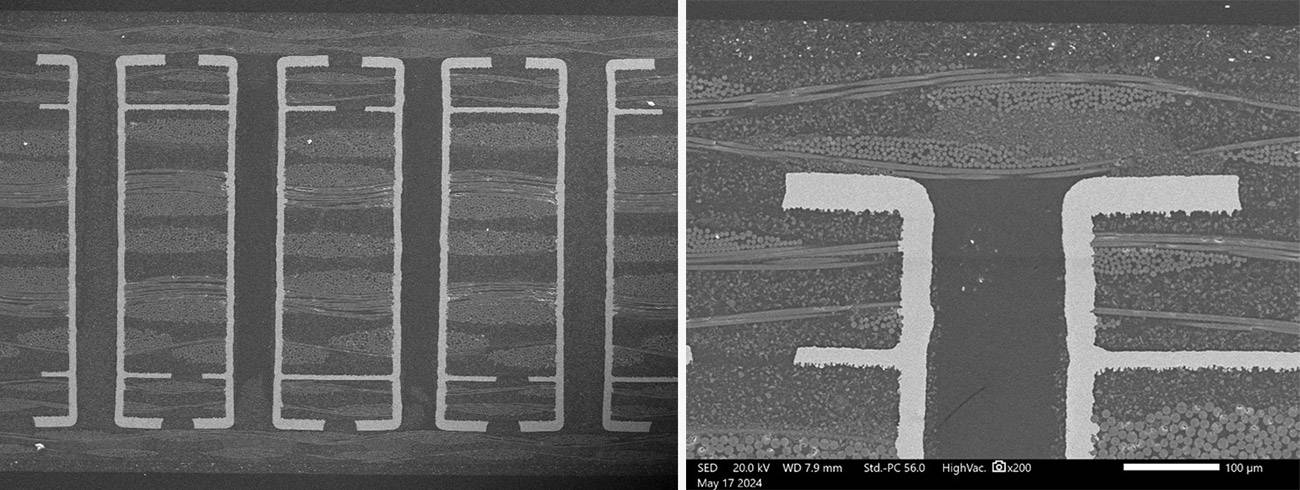 Bei den Prepregs mit dem Glasgewebe 1080 treten weniger Epoxidharzfehler in den passiv verfüllten Buried Vias auf als bei den Prepregs mit dem Glasgewebe 1078. Eine mögliche Ursache für diesen Unterschied ist auf die Luftdurchlässigkeit bzw. die engere Webung der Glasgewebestruktur zurückzuführen, die das Fließverhalten des Epoxidharzes und der Füllstoffe beim Pressvorgang beeinflusst. Des Weiteren hat sich gezeigt, dass bei dem verwendeten Lagenaufbau (Abb. 1) der Multilayer-Leiterplatten das Glasgewebe der Prepregs auf den Kupferstrukturen der Buried Vias zum Aufliegen kommt (Abb. 12). Dies ist darauf zurückzuführen, dass die zu füllenden Volumina in den Buried Vias so groß sind, dass sehr viel Harz aus den Prepregs in die Buried Vias abfließt und dadurch das Aufliegen des Glasgewebes entsteht.