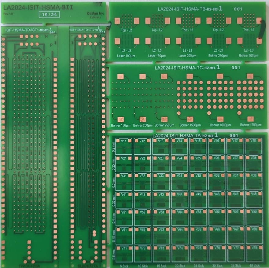 Abb. 3: Übersichtsdarstellung der Testleiterplatte mit mehreren Testcoupons und TeststrukturenFür die Untersuchungen wurden extra verschiedene spezielle Teststrukturen entwickelt und eingesetzt. Einige dieser Teststrukturen überschreiten bewusst technologische Grenzen, um die Technologiegrenzen gezielt zu testen. Dadurch wurde auch bewusst in Kauf genommen, dass aufgrund der großen Volumina in den Buried Vias das Glasgewebe der Prepregs nach dem Verpressen die Kupferhülsen der Buried Vias berühren kann. Eine Übersicht der Testleiterplatte ist in Abbildung 3 dargestellt. Die Testleiterplatten wurden in einem Mehrfachnutzen unter industriellen Bedingungen hergestellt.