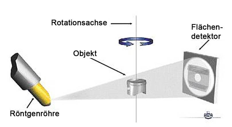 Die meisten Röntgenverfahren sind nicht geeignet, um die Epoxidharzstrukturen in einer Leiterplatte zu analysieren, weil das Harz zu wenig Kontrast bei der Durchstrahlung mit Röntgenstrahlen aufweist. Nur spezielle Röntgenmethoden wie zum Beispiel das CT-Röntgenverfahren (3D-Röntgenverfahren) oder die Röntgenlaminografie (XCL) sind in der Lage, auch Fehler im Epoxidharz zu analysieren. Bei der CT-Röntgenanalyse wird elektromagnetische Strahlung in einer Röntgenröhre mittels beschleunigter Elektronen an der Anode erzeugt. Dieser entstehende Elektronenstrahl wird über ein Hochspannungsfeld mittels elektromagnetischer Linsen fokussiert. Je nach Größe des Brennflecks spricht man von Mikrofokus- und Nanofokuslinsen mit einer Auflösung im Mikrometer- oder im Nanometerbereich [10,11]. Während 2D-Röntgensysteme Objekte in der Regel senkrecht oder unter einem schrägen Winkel betrachten, wird mit einem Computertomografen ein räumliches Bild erzeugt. Hierzu werden vom Prüfling während einer schrittweisen Rotation um 360° viele Einzelbilder erzeugt, aus denen ein digitales Volumen errechnet und zu einem 3D-Bild zusammengesetzt wird (Abb. 4). Diesen Vorgang nennt man Rekonstruktion.
