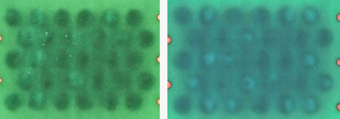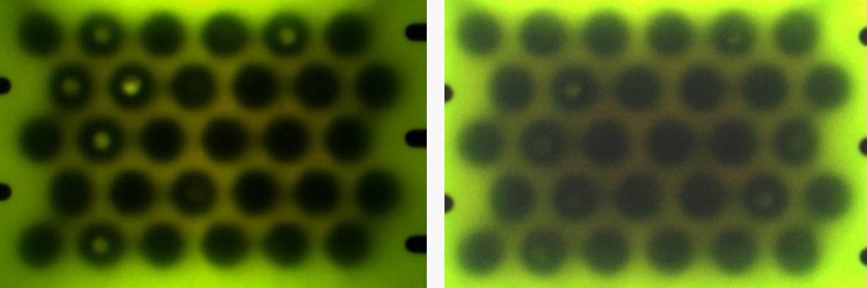 Abb. 6: Inhomogene Füllstoffverteilung an der Oberseite der Leiterplatte über den Buried Vias im Auflichtverfahren bei 200 μm Bohrdurchmesser (l.) NP-155FB-1080MR, (r.) NP-155FB-1078MR