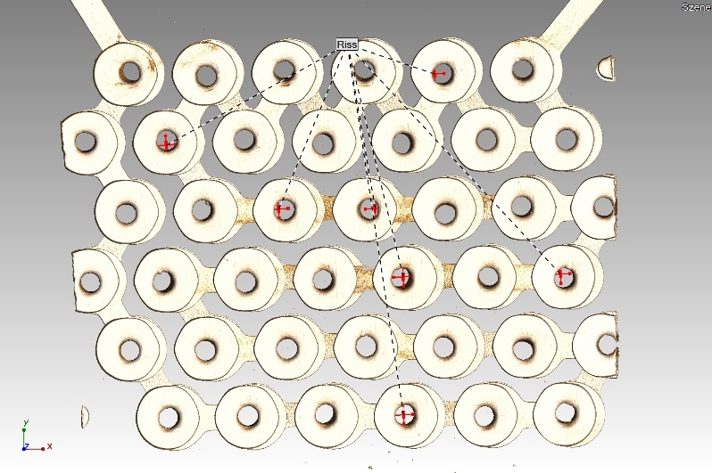 Bei den Untersuchungen hat sich gezeigt, dass in den passiv verfüllten Buried Vias Risse oder andere Fehler im Epoxidharz auftreten, die mit dem CT-Röntgenverfahren zuverlässig nachgewiesen werden können (Abb. 8 und 9). Die Fehler treten generell in den Bereichen des Epoxidharzes auf, in denen kein Füllstoff vorhanden ist. Die Ursache der Rissbildung sind wahrscheinlich auftretende mechanische Zugspannungen, die im Herstellungsprozess der Leiterplatte während der Abkühlphase durch thermische Schrumpfungen entstehen. Bei einem E-Modul von etwa 4 GPa für das Epoxidharz ergeben sich näherungsweise in z-Richtung Zugspannungen von etwa 25 MPa.