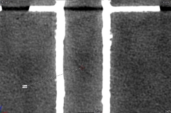 Das Ergebnis der Rekonstruktion hängt von verschiedenen Parametern bei der Röntgenaufnahme und bei der Durchführung der Rekonstruktion ab. Bei der Rekonstruktion wird ein dreidimensionales Gitter mit einzelnen Gitterpunkten erstellt. Ein Gitterpunkt im dreidimensionalen Gitter wird als ‚Voxel' (Volumen-Pixel) bezeichnet. Um mit der CT-Röntgenanalyse Harzstrukturen zuverlässig zu charakterisieren, wird eine hohe Auflösung benötigt. Dies bedeutet, dass die ‚Voxel Size' im Bereich von etwa 1 bis 2 µm oder darunter liegen sollte. Um dies zu erreichen, müssen die Proben dicht an der Röntgenquelle positioniert werden. Dadurch wird die Probengröße bei einer solchen hochauflösenden CT-Röntgenanalyse eingeschränkt. Für die röntgentechnischen Untersuchungen wurde ein CT-Röntgengerät von der Firma General Electric Company/GE (früher Phoenix) eingesetzt. Zur Rekonstruktion der CT-Röntgenaufnahmen wurde die Software VGStudio Max 2.2 von Volume Graphics verwendet.