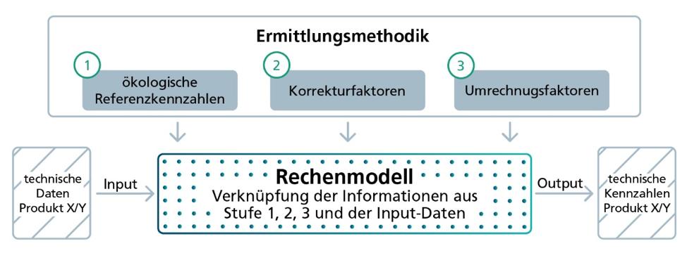 Diese drei Schritte der Ermittlungsmethodik wurden in ein Rechenmodell integriert, welches eine automatisierte Anwendung dieser ermöglicht. Durch das Einspielen eines Inputdatensatzes mit den technischen Daten der Modellvarianten berechnet das Modell automatisch und in wenigen Sekunden die jeweiligen ökologischen Größen.