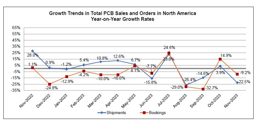 IPC releases PCB industry results for November 2023, North American PCB Industry Shipments Down 22.5 Percent in November, 20.12.2023.