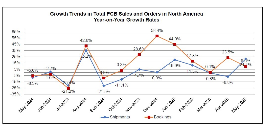 Abb. 2: Wachstumstrends beim gesamten Leiterplattenumsatz und bei den Bestellungen in Nordamerika (Wachstumsrate im Jahresvergleich) für 2023 (links) und 2025 (rechts)