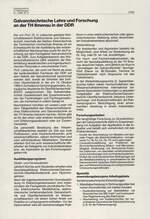 Der von Prof. Dr. H. Liebscher geleitete Wirtschaftsbereich Elektrochemie und Galvanotechnik innerhalb der Sektion Elektrotechnik der Technischen Hochschule Ilmenau ist ein Schwerpunkt für die Ausbildung des wissenschaftlichen Nachwuchses sowie für die Forschung auf dem Fachgebiet Galvanotechnik in der DDR. Zum Aufgabenbereich des Wissenschaftsbereichs zählt weiterhin die Weiterbildung akademischen und ingenieurtechnischen Personals in ...