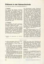 Die Arbeit befaßt sich mit dem Filtrieren in der Galvanotechnik. Es werden einige Grundlagen besprochen, Filterhilfsmittel. Geräte und Filtrier-Verfahren besprochen. Neben praktischen Hinweisen sind Formeln zur Berechnung der Vorgänge erarbeitet und angegeben. This paper deals with the subject of filtration in electroplating. Apart from several basic aspects of this problem, filtration processes, equipment as well as filtering aids ...