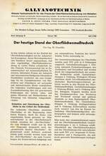 Vorbehandlung, reinigende und schichtbildende Verfahren, deren Grundlagen und Anwendung (Dr. phil. E. Wagner, Farbwerke Hoechst,) (Werk Griesheim) Jede Vorbehandlung von Werkstücken und Apparateteilen hat sich nach der Endbehandlung (Einölen, Lackierung, Metallisieren oder Galvanisieren) zu richten. Für alle gilt die Regel, daß sie vor der Endbehandlung in gereinigtem Zustand vorliegen müssen. Einige dieser Endbehandlungsverfahren ...