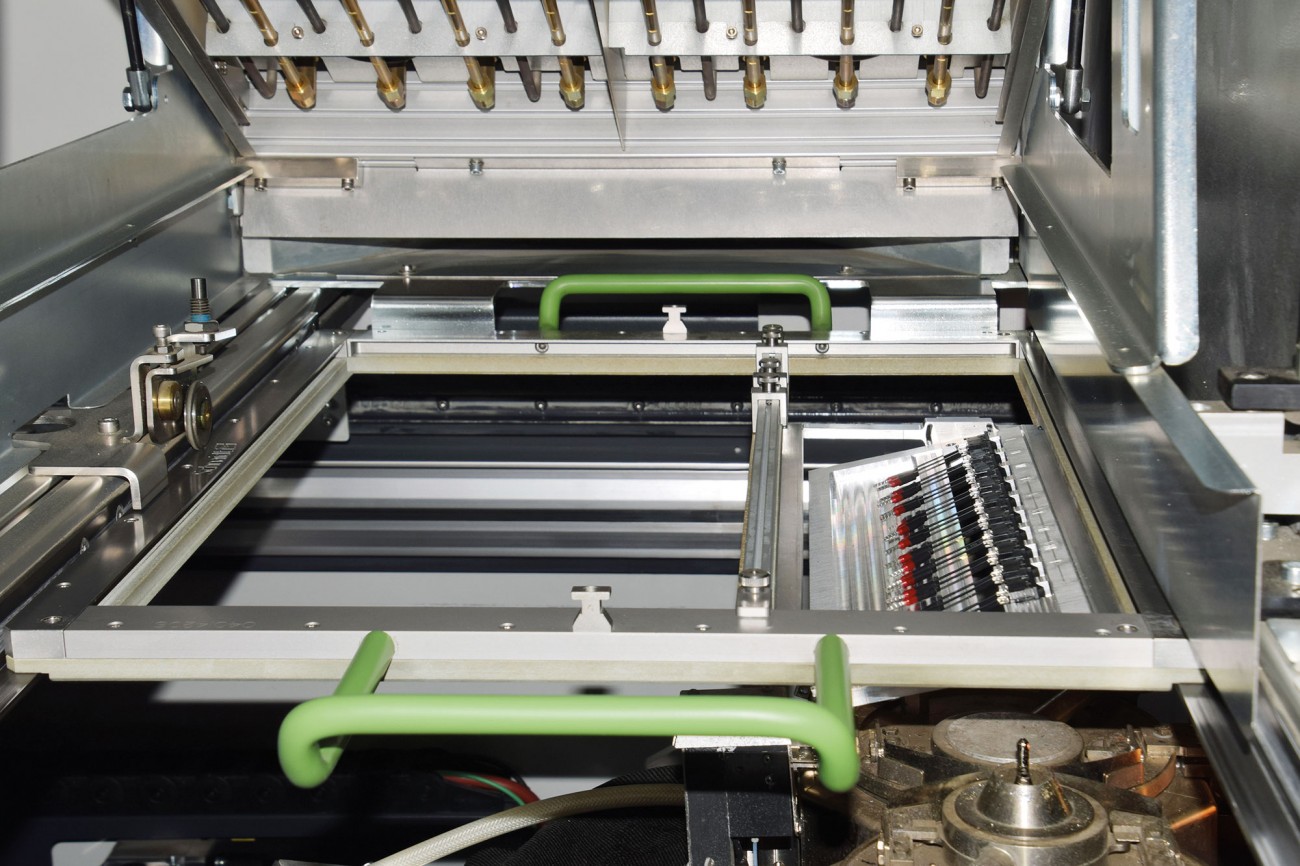 Schablone mit zehn Schalterkomponenten in der Selektivlötanlage