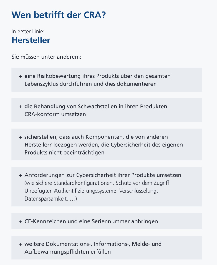 Der CRA erweitert das bisherige CE-Konzept (physische Sicherheit, EMV) um die Pflicht zur Cyber-Resilienz. Hersteller müssen künftig: